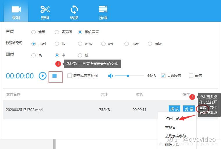 3.第三步,录制完成后用户点停止按钮,在列表里会显示录制的文件名,时长,大小,用户可点击播放查看, 生成的文件已导出在本地,点更多操作选打开目录即可.