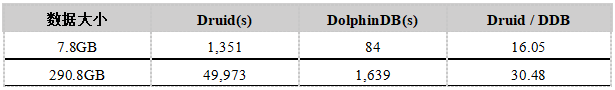 - DolphinDB的数据写入速度大约是Druid的30倍。
