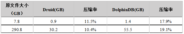 数据导入到DolphinDB和Druid后,我们比较了两者的数据压缩率。测试结果如下表所示。