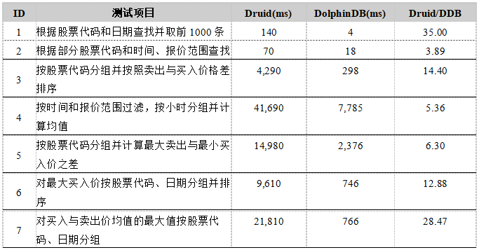 - DolphinDB的查询速度是Druid的10倍左右。