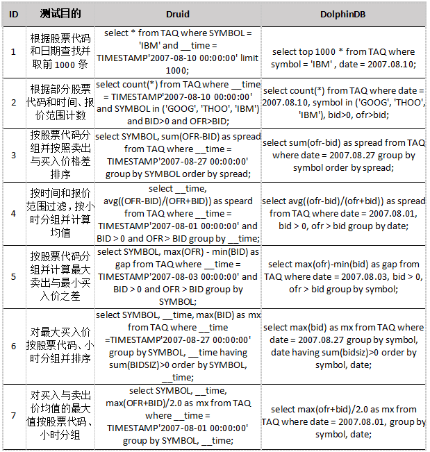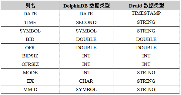 测试数据集TAQ在DolphinDB和Druid中各个字段的数据类型如下所示: