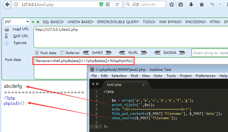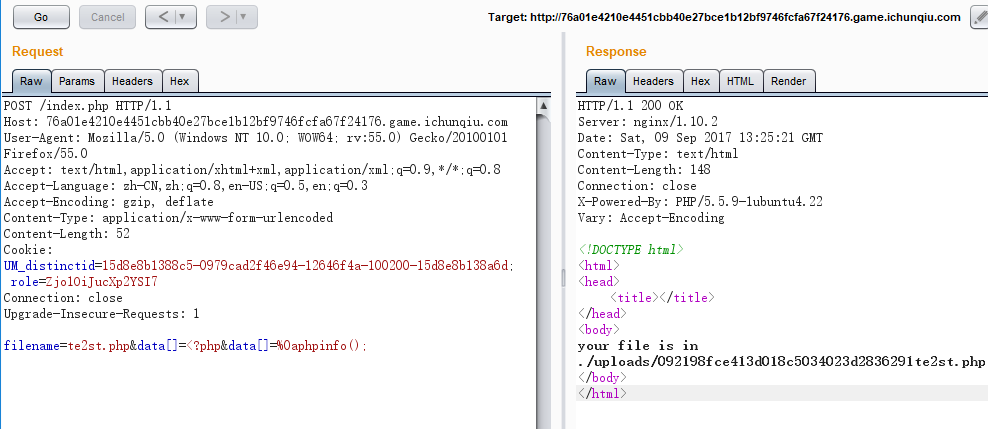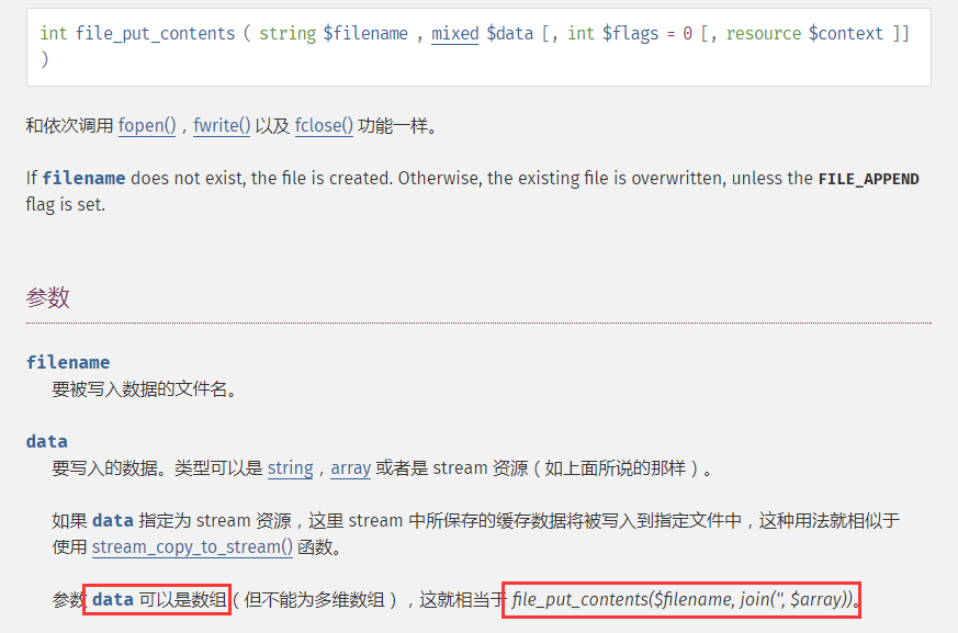 那就随便POST数据filename=test1.php&data=<?php phpinfo(); ?>发现被拦截,但是POST数据filename=test1.txt&data=<?php phpinfo(); ?>可以,而且给出了路径,也可以访问到。这里应该是做了限制。可以猜测后台代码使用了file_put_contents()函数,于是根据PHP手册介绍,第二个参数可以是数组