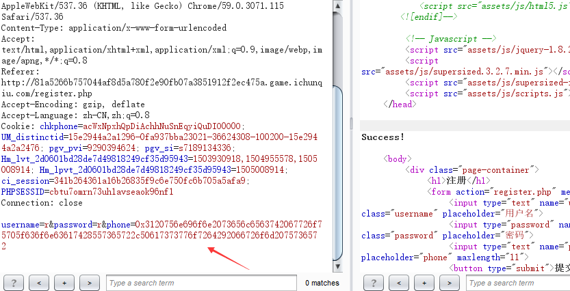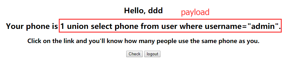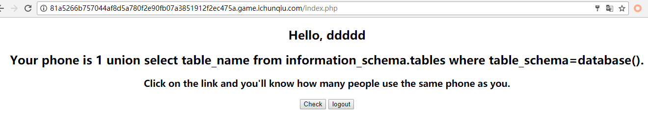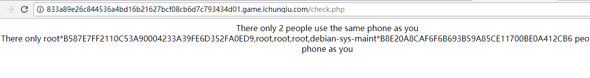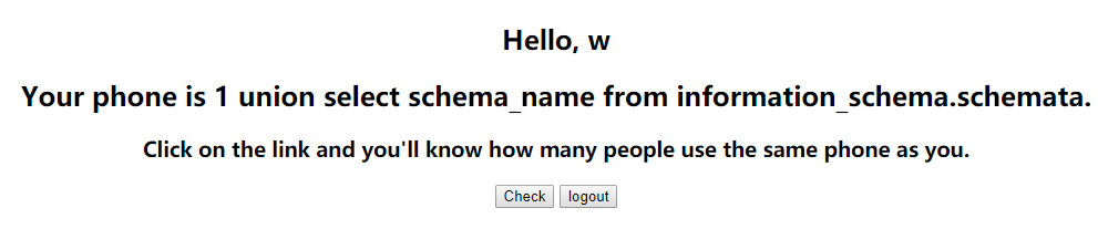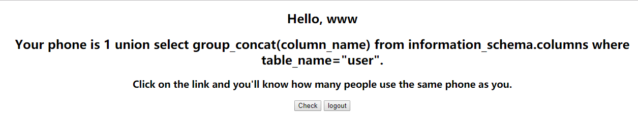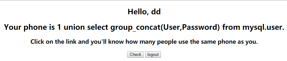 考察sql二次注入,随便注册即可登录,登录后发现有个check按键可以查询有多少人的号码和你一样,这样必定要用到电话号码,并查询数据库,而电话号码只能是数字。所以,思路就是将sql语句转换成16进制进行注册,这样在查询的时候就会执行我们构造的sql语句