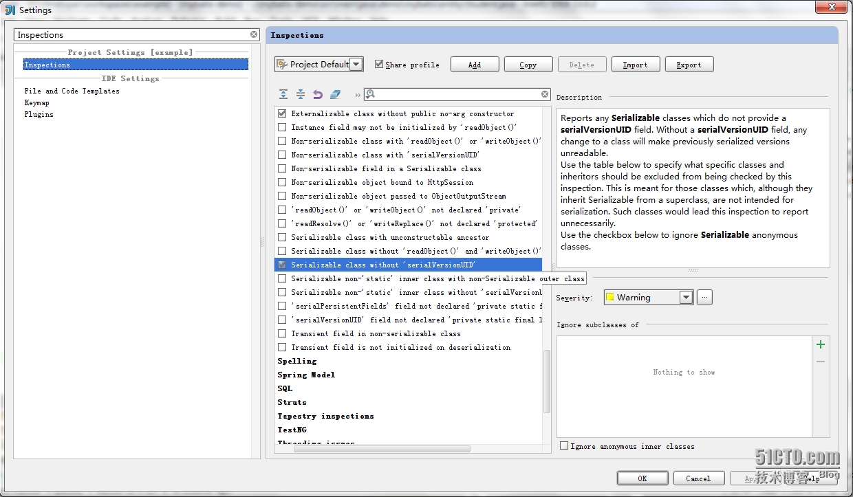 Setting->Inspections->Serialization issues->Serializable class without ’serialVersionUID’