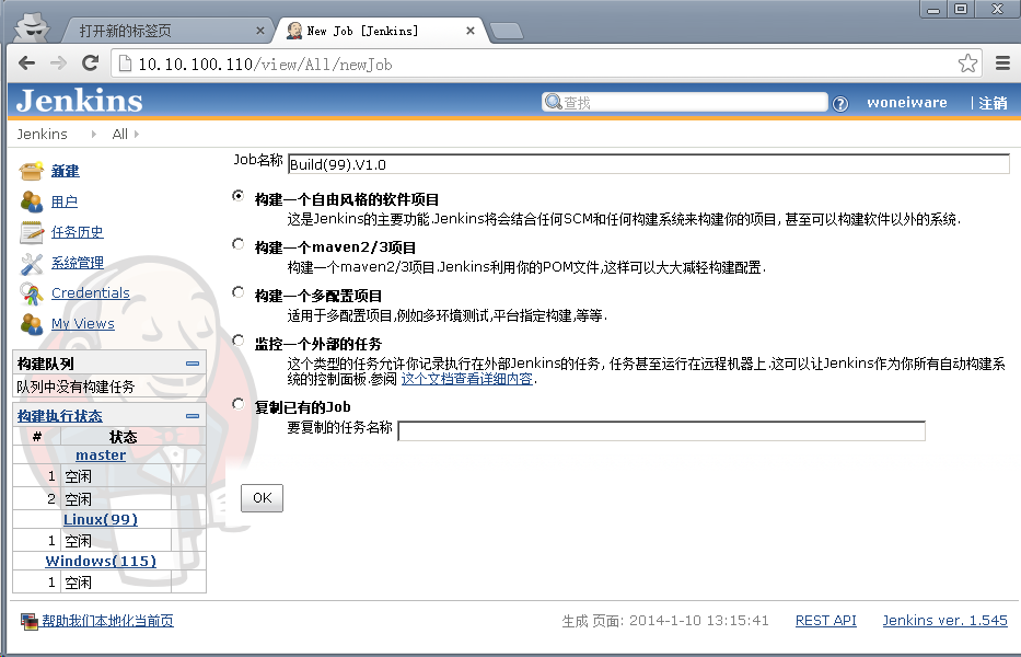 1)以注册用户身份登录Jenkins系统,点击“创建一个新任务”,选择Job类型为“构建一个自由风格的软件项目”,Job名称输入为自定义的名称,点击“OK”进行创建Job;