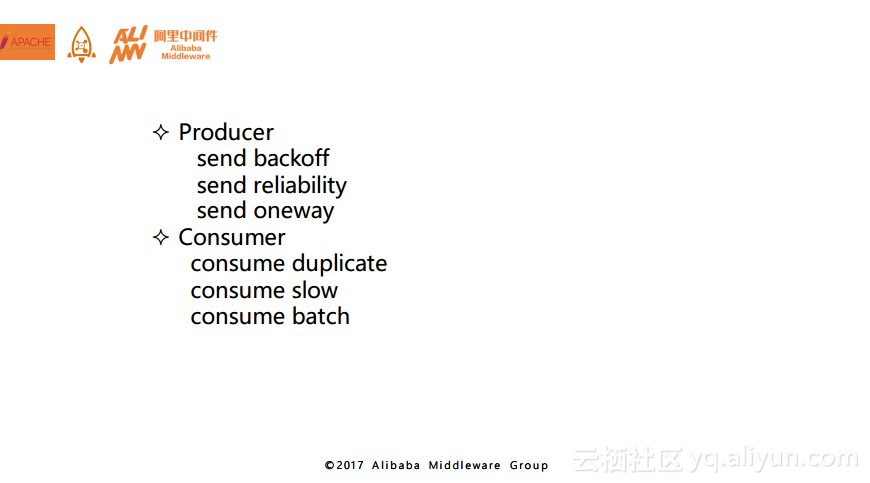 而对于消费者端而言,有几块也需要重点关注。一个是重复消费问题,一般情况下推荐大家通过存储介质探重。而如果消费失败了或者消费速度太慢怎么办,有什么样的方式可以解决呢?一种方案就是通过并发去解决,可以通过提高并发的通道实现。第三块就是consume batch的问题,在RocketMQ里面默认的batch是32,如果大家觉得自己消息引擎吞吐量比较低就可以提高batch,但是如果不对于服务端的限制进行调整,batch最多也就只能达到32。