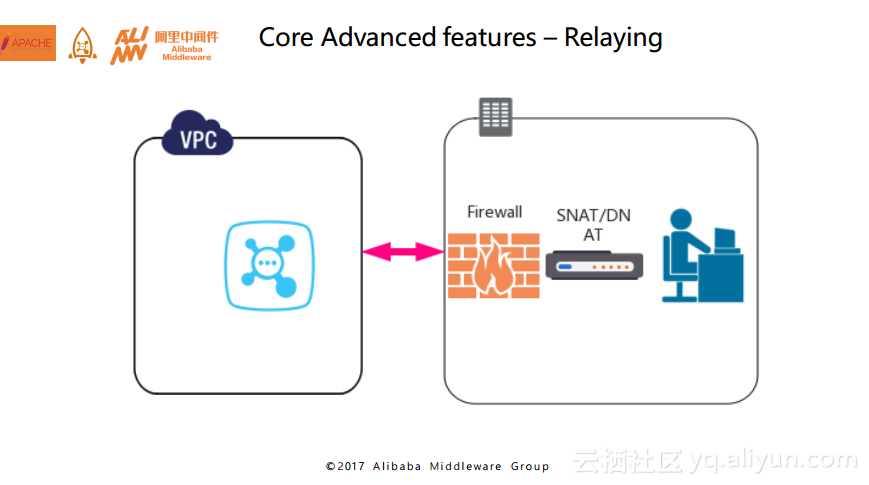 接下来这个高级特性也是目前在Aliware MQ上公测的所谓的中继产品,这个产品目前也是在消息引擎中进行孵化的,它主要解决了跨网络的问题。下图中左边是一个VPC私有网络,右边其实也是一个私有网络,如果要让这两个私有网络之间的应用进行网络互通,就需要为其搭建一套Relaying中继集群,在两个私有网络都能够访问公网的前提下,通过中继服务就可以实现两个私有网络的双向通讯。这个特性可以说是极其变态的。想想看,都已经私有网络了,还有通讯的需求,除了传统那种复杂的硬件白名单各种配置机制外,中继服务提供了一种灵活的软件服务级别的细粒度控制。