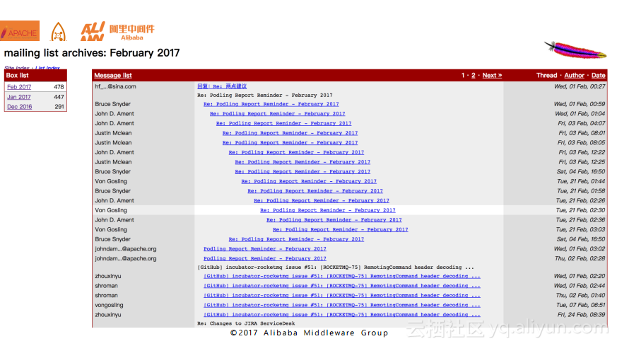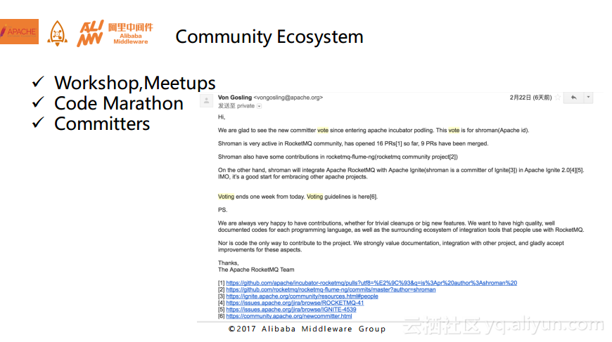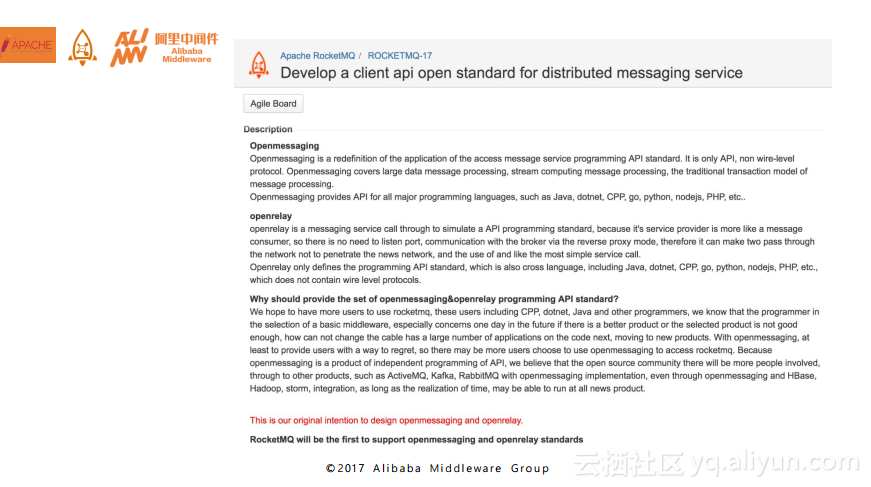 下图列出了目前在Apache官网上发起的关于Open Messaging规范的讨论,大家可以到官网上进行仔细阅读。目前这套API的初稿已经完成了,我们也在与阿里巴巴之外的像推特和雅虎这些MQ厂商进行联系,讨论并验证这套规范能否适用于之前提到的电子商务等四个领域。