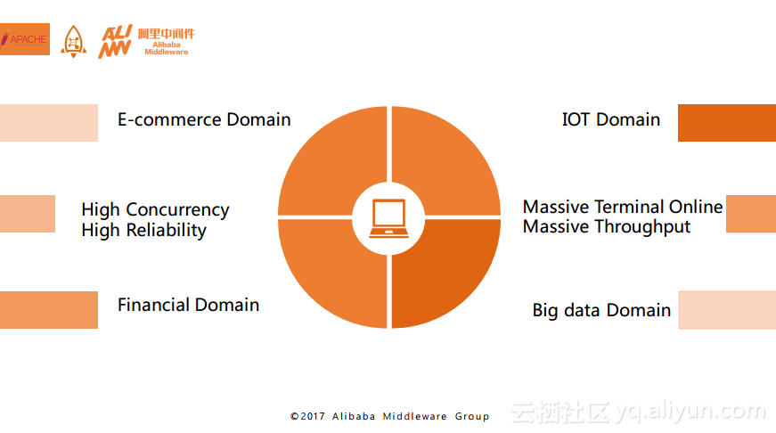 其实目前我们也在RocketMQ 社区里面发起了这样的一个讨论,确定了在未来RocketMQ 4.X版本将会专注于电子商务、金融、物联网以及大数据等领域。而在电子商务领域,RocketMQ重点需要解决的还是高并发的问题;在金融领域重点需要解决的是消息的高可靠,也就是之前提到的分布式事务处理;在物联网loT领域需要重点解决的一个问题就是所谓的海量终端在线也就是海量长连接问题;而在大数据领域,RocketMQ需要重点攻克的就是海量的消息吞吐问题。