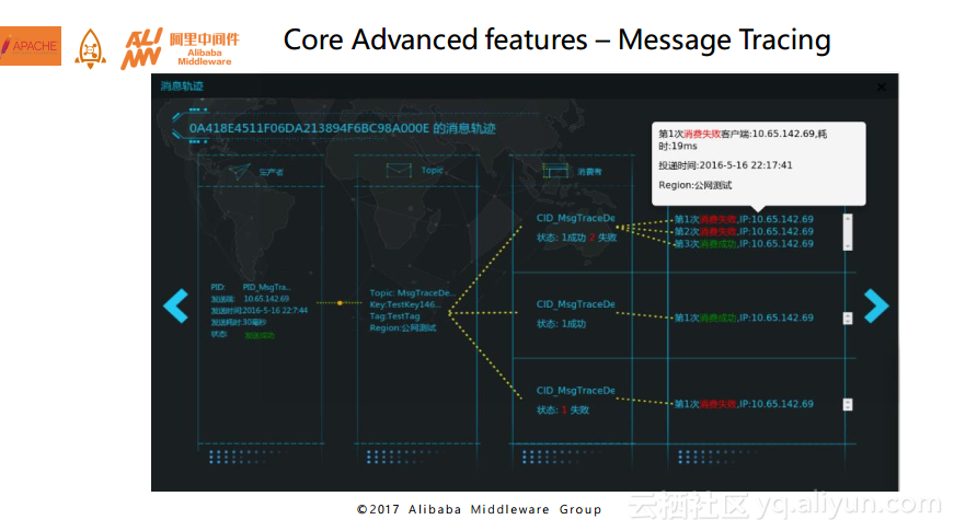 Aliware MQ的第三个特性也是非常有意思的,这个特性主要解决的是分布式链路追踪问题。从下图中可以非常清楚地看到,消息被发送到服务端,再投递给消费者,其中还包括了失败的次数以及一些时间点的信息。