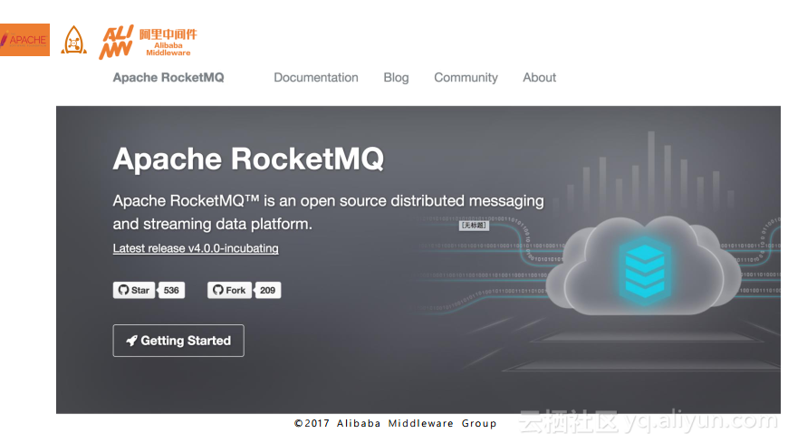 在为大家介绍完阿里巴巴内部的消息流转的体量之后,再给大家近距离围观一下目前Apache RocketMQ的情况,如下图所示就是RocketMQ的官网,欢迎大家Star和Fork。