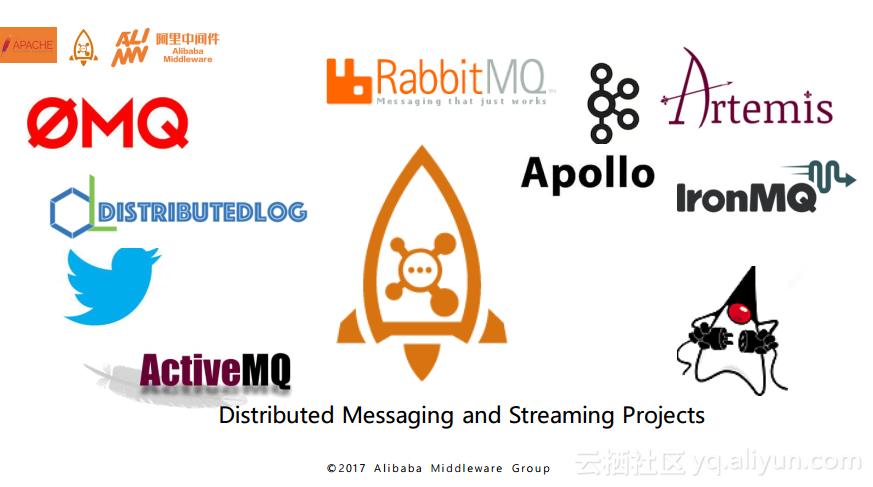 那么目前在业界有哪些比较知名的消息引擎呢?如下图所示,这里面几乎完全列举了当下比较知名的消息引擎,包括ZeroMQ、推特的Distributedlog、Apache旗下的老牌消息引擎ActiveMQ、AMQP的默认实现RabbitMQ、Kafka、Apache的ActiveMQ下的子项目Artemis、同样为Apache的ActiveMQ的子项目的号称下一代消息引擎的Apollo、商业化的消息引擎IronMQ以及实现了JMS(Java Message Service)标准的OpenMQ,还有就是毫无疑问的今天分享的主角——Apache RocketMQ。