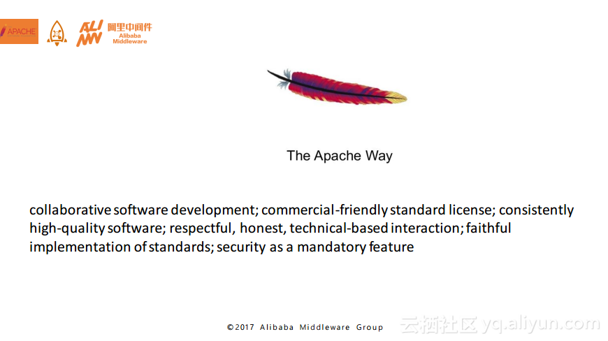 聊完了社区之后,还想与大家分享一下在RocketMQ的孵化过程中我们对于Apache基金会的初步认识。下图中的几个关键字其实非常准确地描述了Apache Way,那么什么是Apache Way呢?Apache非常强调对于软件进行合作开发,并且在实际上对于商业化的协议也是比较友好的,Apache还强调产品需要保证高质量,讲究尊重和诚实,并且强调基于技术的交互和对于规范的坚定实现的信念,最后还是将产品的安全特性作为强制要求进行考虑。