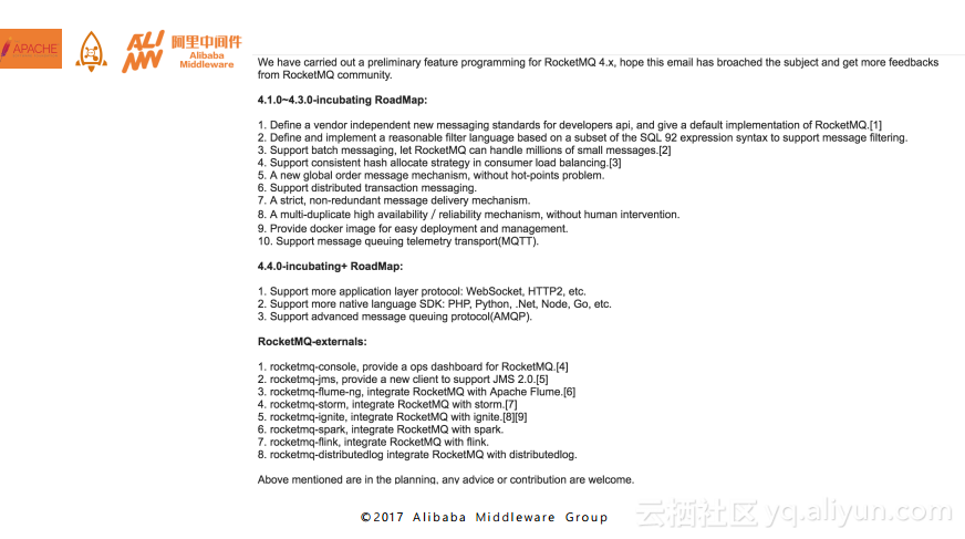 下图就是为大家列出最近RocketMQ 4.0在开源社区发布后,预期在RocketMQ 4.1至4.3版本中将会提供的一些特性。大家可以到官网上进行查看,感兴趣也可以参与进来。