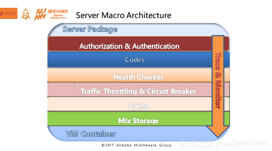 下图为RocketMQ服务端的整体架构设计。首先最上层是授权和认证部分,因为RocketMQ是基于TCP的自行研发的一套线路层协议,所以它需要编解码以及序列化。再接下来可这一层是健康检查,在健康检查之后是流控和熔断措施,因为再好的系统也需要流量保护,RocketMQ也是一样,为了良好的可用性,RocketMQ提供了针对于不同维度的流量控制。再往下就是存储,总体而言RocketMQ服务端对于部署运维是非常友好的,目前阿里巴巴内部也有很多系统在进行Docker容器化。