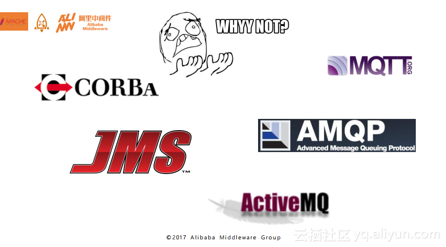 有了以上的目标之后,我们希望能够基于统一的架构进行实现,那么这其实很容易想到就是基于某种规范去实现四个领域里面的编程API的统一。下图中列举出了五个业界非常有名的消息领域的规范。CORBA是分布式领域里面一个非常古老的规范,CORBA里面有专门针对消息的一章就是Notification Service,CORBA的协议是非常学术化的。而JMS是大家都比较熟悉的,它是Java领域的一套编程API。MQTT和AMQP都是OASIS组织下的协议,MQTT是面向物联网的线路层协议,而AMQP也是消息领域的一个线路层协议,很明显,它只是一个协议。ActiveMQ中内置了OpenWire,它也是一个线路层协议。上述的这些协议在我们看来都无法完全满足对于四个领域的需求标准。