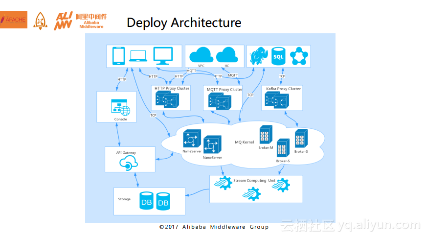 下面这幅图为大家展示了现在的阿里巴巴内部消息引擎的部署架构图。从图中可以看到所谓的kernel就是RocketMQ,在kernel之外还外置了像专门为物联网提供解决方案的MQTT网关、主要解决多语言跨网络问题的HTTP网关、兼容Kafka 0.10.X协议与官方持续保持兼容的Kafka网关。