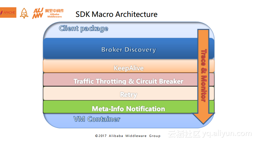 下面这幅图展示的是SDK的架构图。毋庸置疑第一步需要做的事情是服务发现,需要去找到发消息或者收消息具体的broker以及broker上的Topic,在此之外SDK还会需要做的事情就是长连接的保活。接下来与服务端相同,要有流量控制以及熔断机制,另外为了保证实现高可用性,就需要提供补偿机制,这种补偿机制表现在发送端的Retry和接收端的Redelivery,也就是重投和重发。接下来,在SDK层还存在元信息通知更新消息,比如nameserver上数据变更就需要进行通知。