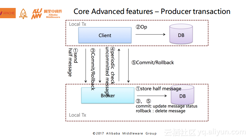 接下来为大家分享在Aliware MQ上几个比较优秀的特性。第一个就是常见的事务消息,这里的事务消息指的其实是数据发送者事务消息,简单而言就是在真正地做业务逻辑之前会发送一条半消息到服务端,接下来发送者会执行本地的事务,在完成本地事务之后,如果成功就会向服务端发送一条确认信息,这时候服务端会将之前的半消息事务状态进行变更;如果失败了,服务端就会不断地回调客户端,来保证发送端的事务一致性。