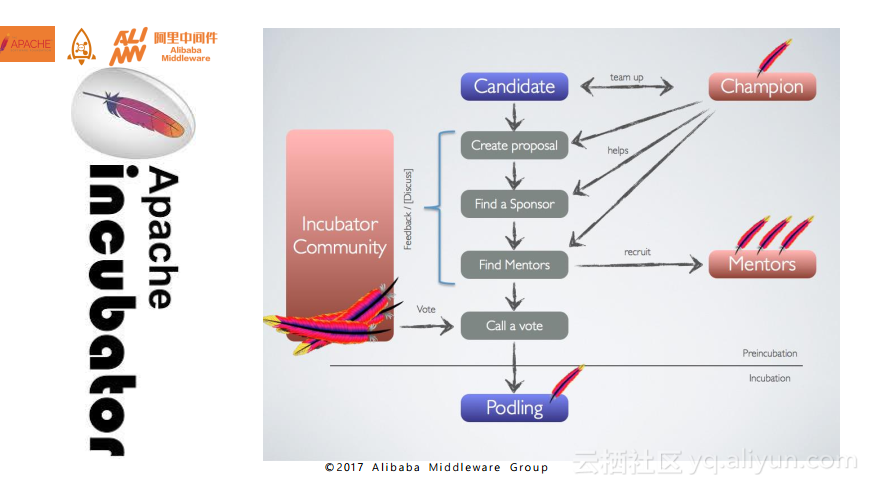 下图就是在Apache基金会对于项目进行孵化的流程。RocketMQ在孵化期间也是按照这个流程一路走来的。接下来就为大家简单介绍一下,首先要进行孵化需要选好自己的领路人,也就是Champion的概念,领路人将会对于项目在Apache上的孵化起到非常大的推进作用,所以如果大家有志于将自己的产品推到Apache上,一个好的领路人对于项目能够进入Apache是非常重要的。这里面的具体流程就是在社区起草一个提议,当提议通过了之后可以召集大家讨论一下提议的可行性,然后进行投票,在投票之后如果社区愿意接受产品的话就会真正地开启自己的Apache孵化之旅,也就是达到了图中最后一步的Podling。