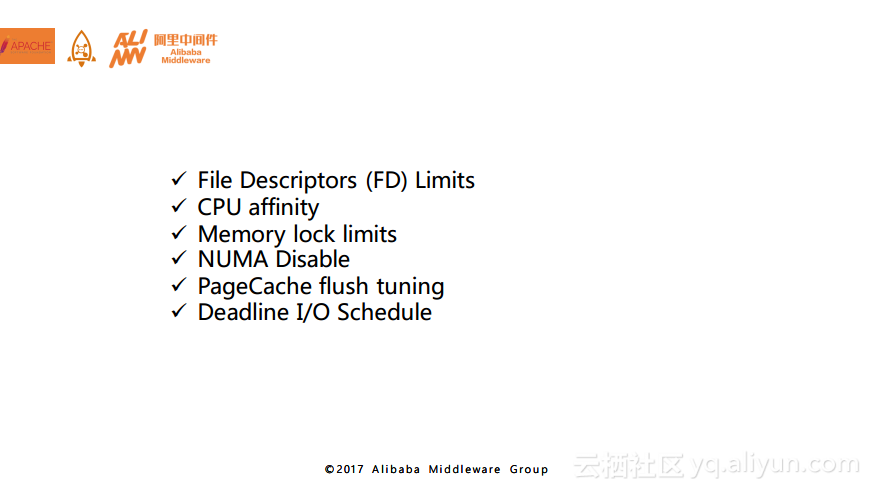 而通过很多的线上观察,我们发现在线程处理来自外部的请求的时候,对于内存的访问其实都是随机的,所以交叉分配方案可以使得线程对于内存的访问进行打散,具有一定程度上的提升。还有一部分就是PageCache flush调优,因为MQ的存储其实是一个文件系统,那么就避免不了与PageCache打交道,而PageCache里面就有很多可以进行调优的,包括脏页回写,换页机制等,这些都是进行调优的重点。最后一部分就是对于磁盘的I/O调度的调优,大家都知道在磁盘的I/O调度方面,Linux操作系统默认为我们提供了四种方式,而通过线上的观察以及实验建议大家将默认的调度方式变为Deadline方式,也就是最后期限调度算法,这样就可以有效地避免I/O写请求饿死情况的出现。