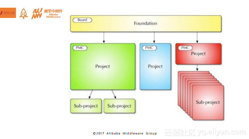 接下来还要分享一下Apache项目的组织结构。最上面是董事会,每个项目在Apache里面都有自己的PMC组织,也就是项目管理委员会,在项目管理委员会之下是Committer。而每个项目之间是独立分开的,如果你属于这个项目的PMC并不代表还会属于另外一个项目的PMC。而且在项目之下还会有多个子项目,正如刚才讲到的Apache的ActiveMQ是一个比较老牌的项目,在这个项目之下至少有4个子项目。而RocketMQ目前是一个孵化的项目,如果能够孵化成功就能够成为顶级的项目,也就是下图中标有PMC字样的框框。