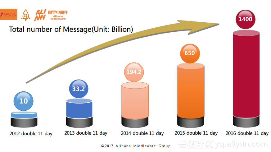 下图是RocketMQ在历年双11的整体情况,可以看出,从2012年开始,每年RocketMQ在整个双11当天的消息流转都会有极大的提升。在2012年大约是100亿的消息流转,在2013年就接近了332亿的消息流转,2014年和2015年都增长得非常迅速,到2015年已经接近6500亿消息流转,在2016年的双11当天整个阿里巴巴集团线上通过RocketMQ的消息流转达则到了1.4万亿。