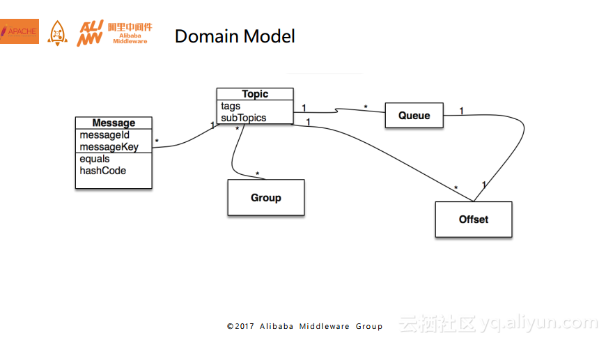 下图是RocketMQ的消息领域模型,主要分为Message、Topic、Queue、Offset以及Group这几部分。
