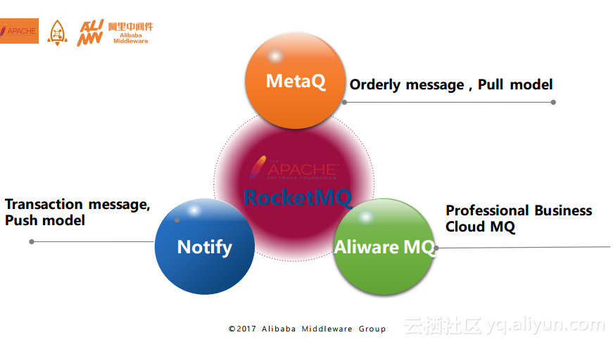 以上就是RocketMQ的整体发展历史,其实在阿里巴巴内部围绕着RocketMQ内核打造了三款产品,分别是MetaQ、Notify和Aliware MQ。这三者分别采用了不同的模型,MetaQ主要使用了拉模型,解决了顺序消息和海量堆积问题;Notify主要使用了推模型,解决了事务消息;而云产品Aliware MQ则是提供了商业化的版本。