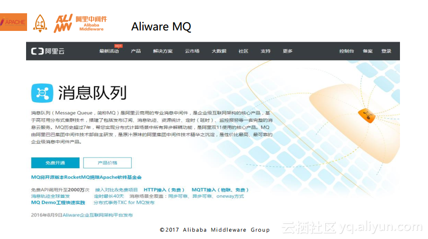 下图展示的是RocketMQ商业化的云上版本Aliware MQ的官方入口。