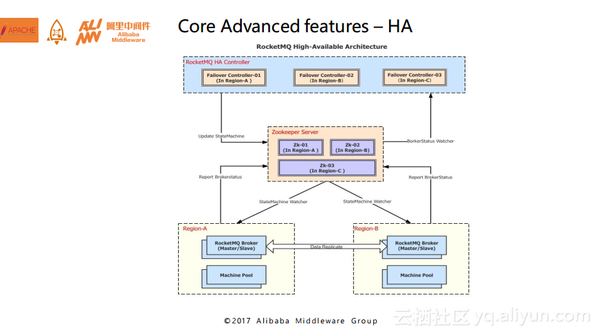 第二个特性就是我们去年最新研发的一套基于原有多机房部署的集群模式,利用分布式锁和通知机制,借助Controller组件,设计并实现了高可用架构。请注意,HA Controller是消息引擎高可用架构中降低系统故障恢复时间的一个重要的无状态组件,通过监听服务状态变更,控制状态机状态切换,进而完成主从状态的一系列切换。