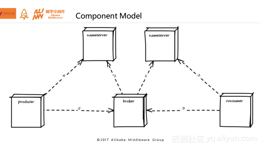 下图为大家清晰地展示了RocketMQ的几个组件,分别是nameserver、broker、producer和consumer。nameserver主要负责对于源数据的管理,包括了对于Topic和路由信息的管理,broker在启动的时候会去向nameserver注册并且定时发送心跳,producer在启动的时候会到nameserver上去拉取Topic所属的broker具体地址,然后向具体的broker发送消息。