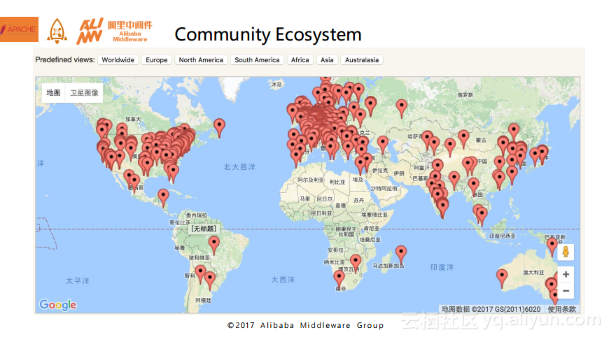 刚才整体的介绍了RocketMQ产品的大致情况,接下来为大家介绍一下RocketMQ社区的发展情况。RocketMQ目前主要的开发和贡献是在中国大陆以及包括韩国和日本在内的亚洲其他国家进行的,而我们希望RocketMQ的社区的开发者和参与者能够遍布全球。下图是在Apache中摘录的Apache的参与者在全球的分布情况,未来也希望在全球范围内都有的开发者能够非常积极地参与到Apache RocketMQ项目中来。