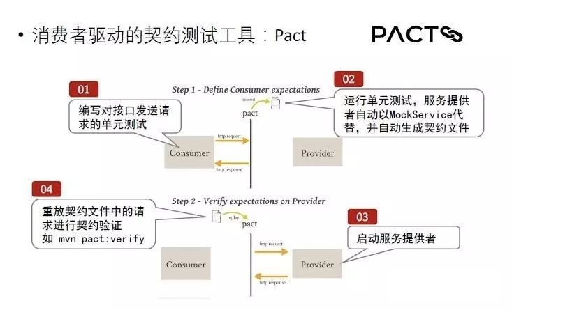 传统情况下做集成测试需要把服务消费者和服务提供者两个服务都启动起来再进行测试,而Pact做契约测试时将它分成两步来做,每一步里面都不需要同时启动两个服务。