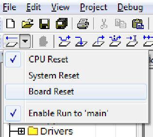 在debug界面下,从Reset (back arrow) Debug下拉框中选择Board Reset选项,进行复位。