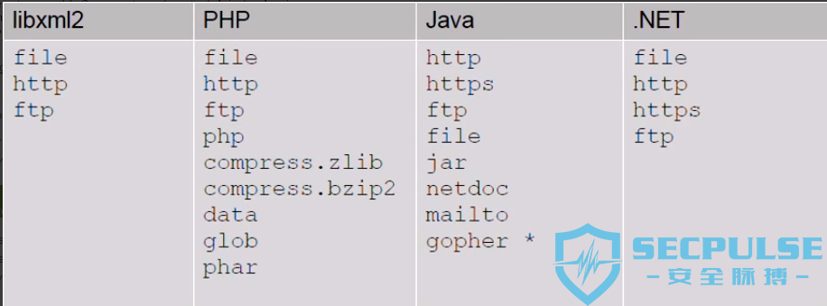 此表由研究员Timothy Morgan提供—这些协议可用于上传文件(jar:// ..),在旧版本Java中允许任意数据通过TCP连接(gopher:// ..),阅读PHP源代码查看PHP的处理方式。