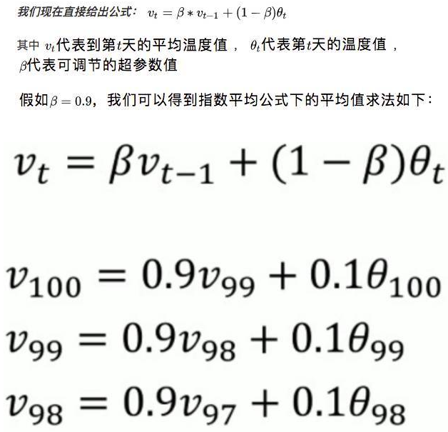 像上图一样,我们V(指数加权平均值) 是约等于上面的公式的。这里的测量值就是我们的迭代次数。假如我们把β设置为0.9. 那么根据公式,那么相当于我们对于过去10次迭代。1除以(1-0.1). 这就是说我们把过去10次迭代的w和b的值算入了指数平均值中。也就是说我们对过去10次迭代的数据作为样本,求出了一个平均值作为指数加权。之后根据这个值更新w和b。之所以说有这么一个公式,是因为我们发现指数是随着时间衰减的,太老的数据可以忽略不计了。 根据经验,我们设置为0.9这个值是比较常见的, 也就是用过去10次迭代作为参考。