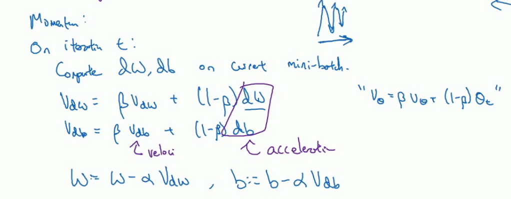 可以看到我们多了一个求Vdw和Vdb, 分别在对w和b的导数上求指数加权平均。然后更新w和b的时候不再是减去学习率*导数了,而是导数的指数加权平均值。其中β就是加权。这也是我们的超参数之一。一般设置为0.9. 它的效果差不多是下面这样的。