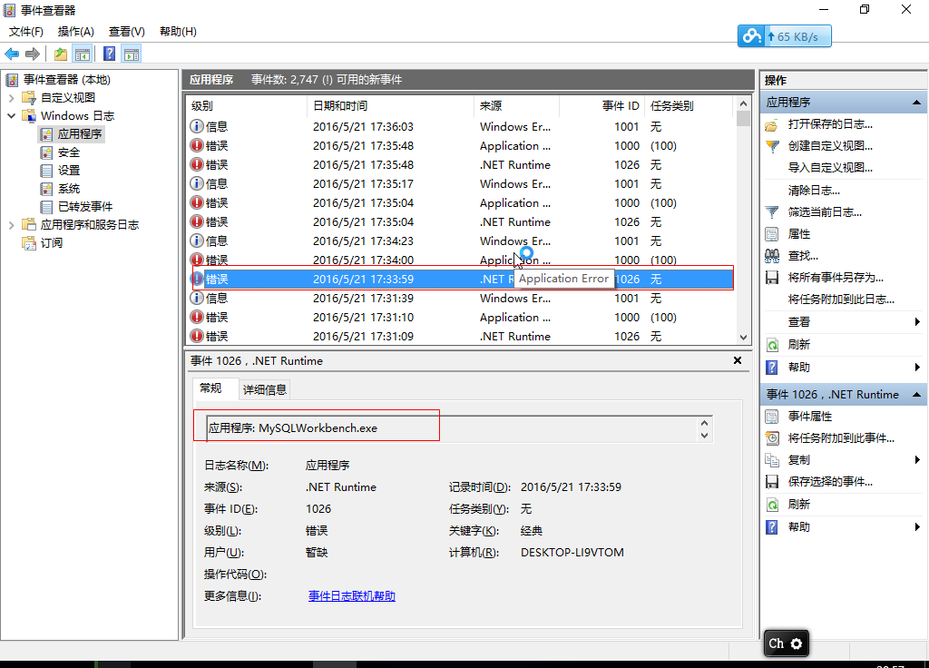 下载的MySQL Workbench ZIP包,解压缩后运行不了,查看windows事件查看器,信息如下:
