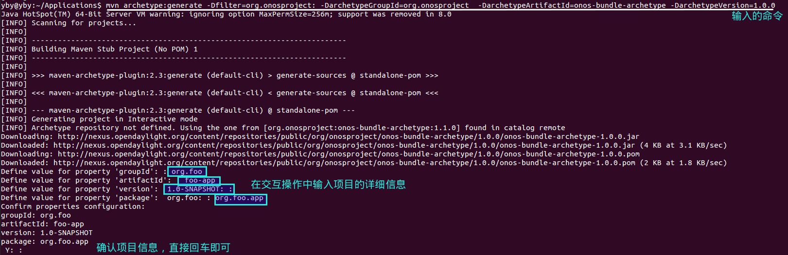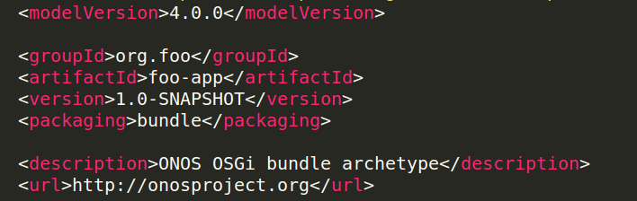 输入此命令的时候,注意你电脑上已有的onos版本号,如果不是1.0.0,请将archetypeVersion修改为对应的数字,如果BUILD FAILURE,则可以先这么生成,然后在生成项目的根目录的pom文件里,修改为你的版本号。如果是快照版本,注意加上SNAPSHOT。