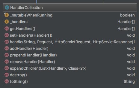 HandlerCollection继承AbstractHandlerContainer,将一组Handler包装起来,并具有单个Handler的特性
