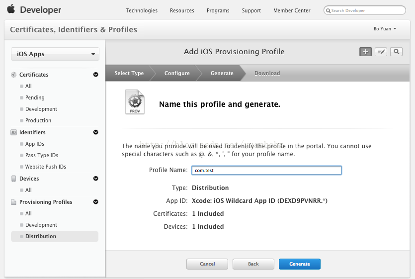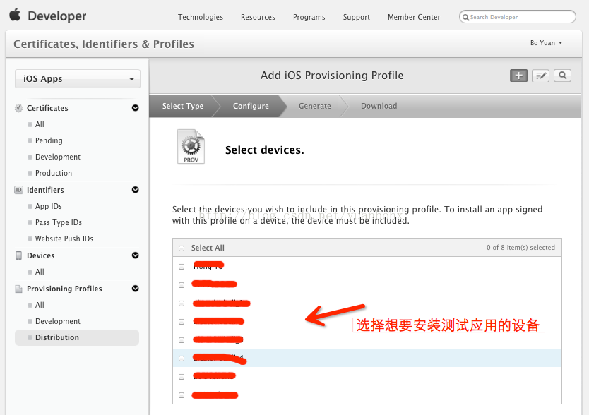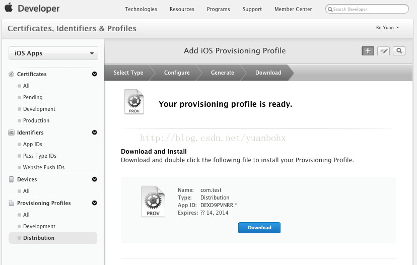 至此,我们就完成了 Provisioning Profile 文件的生成。目前这个生成的文件中,就是包含设备 UDID 的文件。接下来,我们就需要将这个文件导入 Xcode,然后重新打包应用安装包(.ipa文件)。