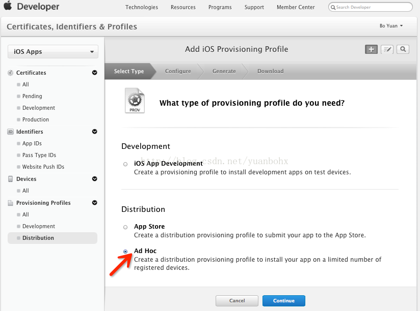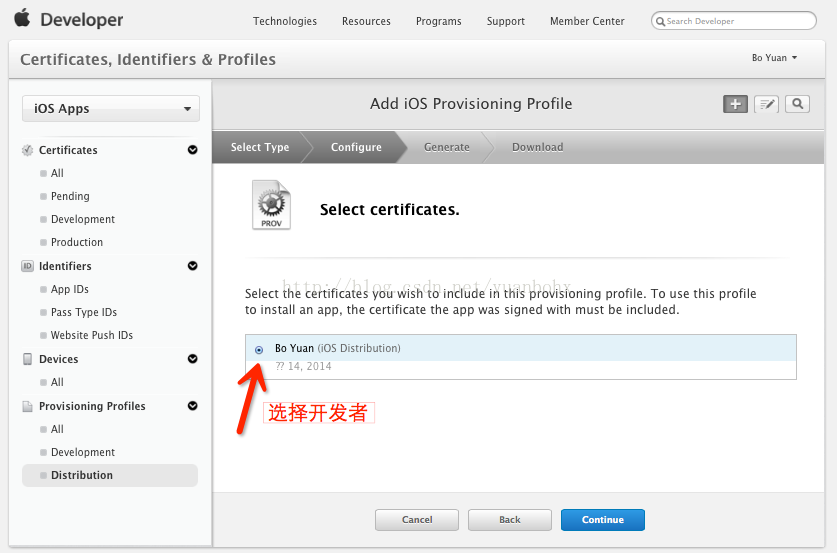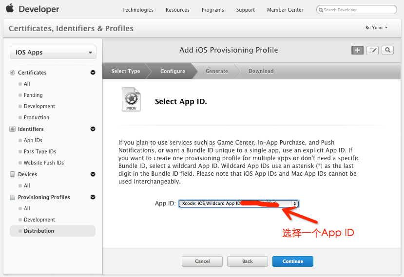 添加发布证书。点击左侧导航栏 Provisioning Profiles 中的 Distribution,添加一个新的证书: