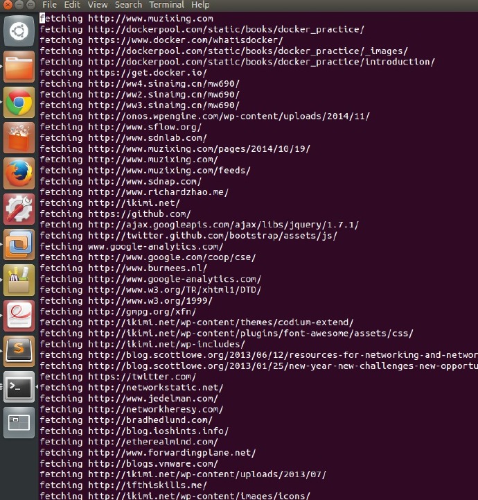 从上图可以看到爬虫抓取了www.muzixing.com的网页中存在的url如http://ikimi.net,然后我们可以看到爬虫又跳到了http://ikimi.net上爬取页面的其他url,如http://www.ikimi.net/wp-includes。如果将起始页面换成bbs.byr.cn会发现爬虫会以更快的速度在整个互联网蔓延开来!