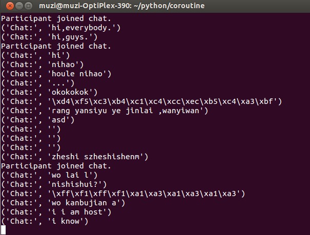 接下来再介绍一个更好玩的程序,多人群聊程序,可以让我们在学习eventlet的时候充满成就感。代码如下: