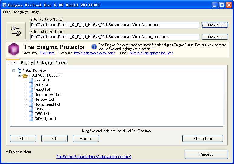 点击左下方的“Add…”按钮,添加所有的依赖链接库文件;然后点击右下方的“FilesOptions”,在弹出的对话框里选中“Enable Files Virtualization”和“CompressFiles”两项;“OK”后返回点击“Process”并等待小伙伴干完该干的活。