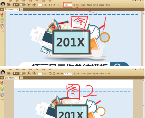 首先我们要进行分辨确实是PDF文档页面尺寸不对,两侧或上下有空白,还是我们打开PDF的页面比例不对呢?可以将PDF的页面比例调整到100%也就是实际大小再查看,如果仍不是我们想要的效果如下图中的图1,则可进行下一步设置。
