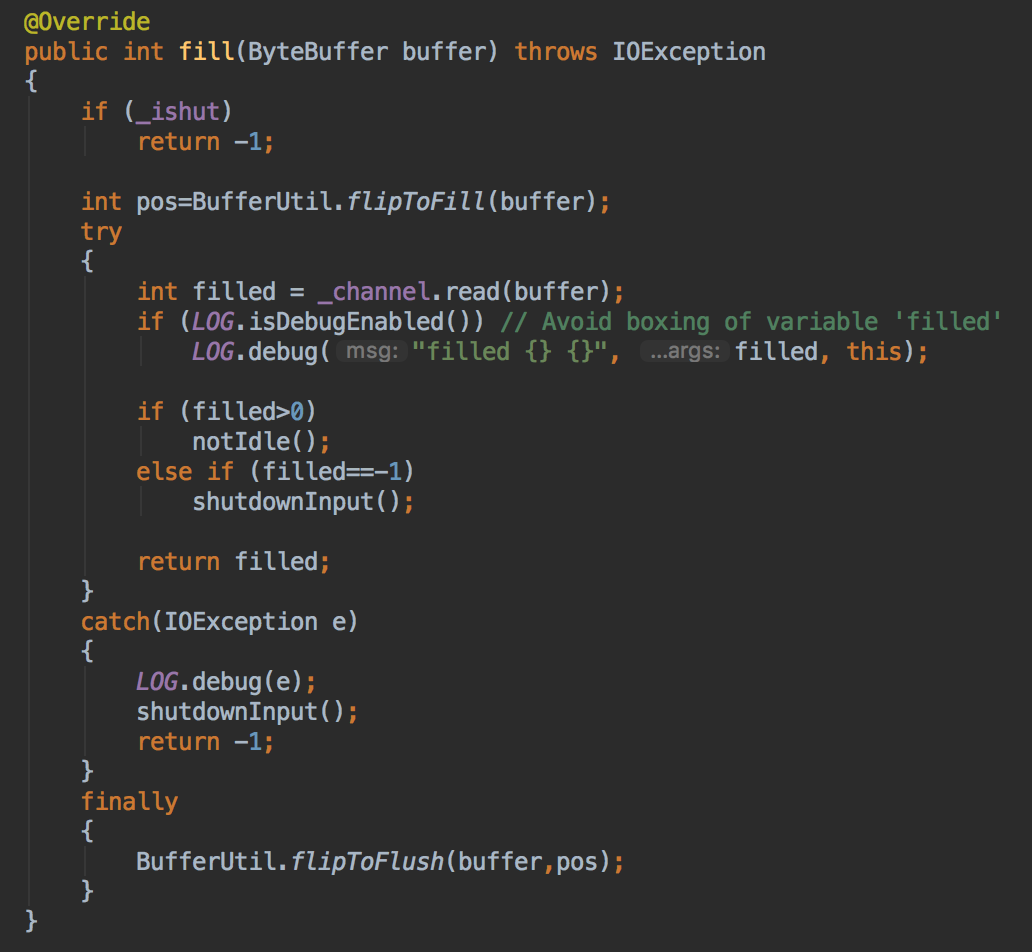 从上面可以看到,其实很简单,就是切换ByteBuffer的模式为读,如果读到了数据,那就把定时器置为非空闲,保证端点的活性,如果读到-1了,那就是EOF,连接的读方向已经跪了,所以关闭输入,最后返回读到了多个字节,出现IO异常也是关了输入方向,最后把Buffer切回到写模式