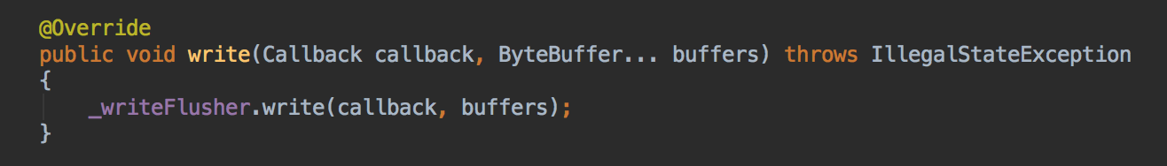 WriteFlusher的实现首先调自己的flush方法,完成刷缓冲(这个下面会解释),这个flush方法会返回未完成写入的Buffer,如果存在未完成的Buffer,这里会将这些Buffer作为PendingState存下来,并利用onIncompleteFlush来向Channel的SelectionKey修改OP_WRITE的操作,这样其实就能在之后仍然保证之前的数据能刷完。如果flush一次性刷完了,那其实也不用改OP_WRITE,因此直接就callback.succeeded了